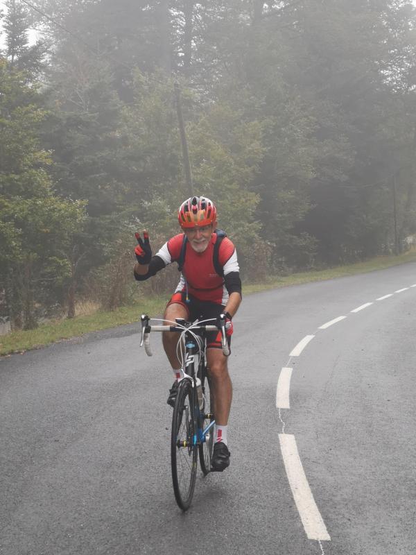 Jolis paysages dans la brume et chacun monte à son rythme pour atteindre le col de Porte dAspet. Un seul bémol dans cette montée. Sur6 km, une trace de carburant large de plus d’un mètre était sur notre voie....venir en montagne pour respirer l’air pur des cimes.